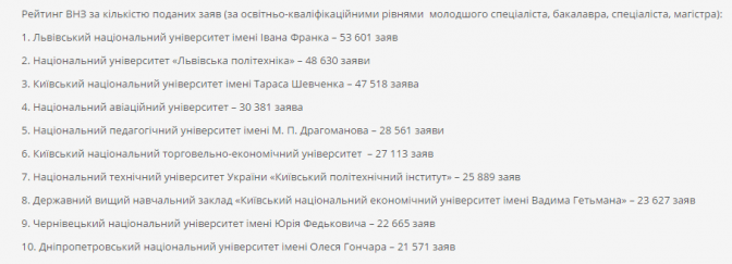 В Єдиній державній електронній базі з питань освіти за освітньо-кваліфікаційними рівнями молодшого спеціаліста, бакалавра, спеціаліста, магістра зареєстровано: 1 729 969 заяв від 499 055 вступників. За кількістю поданих заяв, лідирує Львівський національний університет імені Івана Франка. До цього вишу було подано 53 тис. 601 заяв. На другій сходинці – ще один львівський університет – Львівська політехніка, за ним – Київський університет імені Тараса Шевченка, – інформує сайт МОНу.