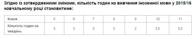 Зокрема, у 2015/16 навчальному році буде збільшено кількість годин на вивчення іноземної мови з 2-х до 3-х на тиждень у 6-9 класах загальноосвітніх навчальних закладів з українською мовою навчання (за новим стандартом).