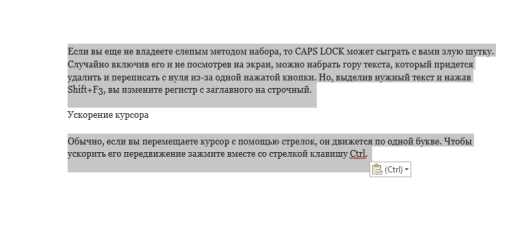 Щоб швидко виділити великий шматок тексту, встановіть курсор в його початок і клікніть мишкою із затиснутим Shift наприкінці фрагмента. Збереже час і нерви в ситуаціях, коли доводиться виділяти кілька аркушів відразу.