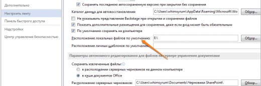 За замовчуванням Word зберігає всі файли в папку «Документи». Для того, щоб змінити це, перейдіть в меню «Файл» – «Параметри» – «Збереження». У рядку «Розташування локальних файлів за замовчуванням» виберіть потрібну вам папку. У цьому ж меню ви можете налаштувати формат документів за замовчуванням, автозбереження і багато іншого.