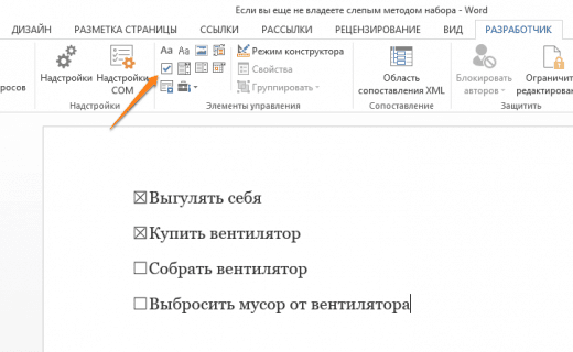 Перейдіть у вкладку «Розробник» і знайдіть елемент «Прапорець», на якому зображена галочка. Тепер, натискаючи на прапорець, ви можете створювати списки завдань і позначати їх, як виконані.