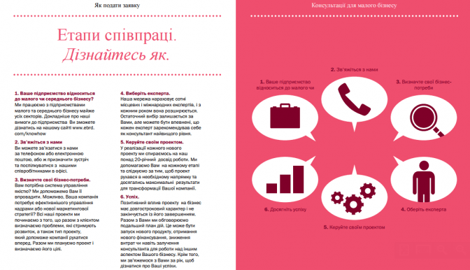 Представники ЄБРР допоможуть знайти кваліфікованих консультантів, які оцінять готовність виходу продукції на експорт, а також допоможуть визначити найперспективніші ринки саме для вашої продукції, налагодити зв'язки з потенційними партнерами, – інформує facebook-сторінка «Міністерство економічного розвитку й торгівлі України».