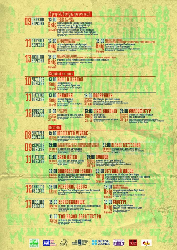 Загалом програма розбита на три частини. Серед них вистави, сценічні читання та зустрічі/бесіди/презентації.