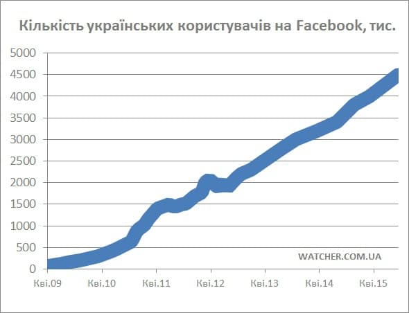 Кількість українських користувачів за останній рік зросла на 30%, в абсолютних цифрах приріст склав 1 мільйон. Станом на вересень 2015 року в Україні 4,5 млн користувачів Facebook (у вересні 2014 було 3,5 млн).