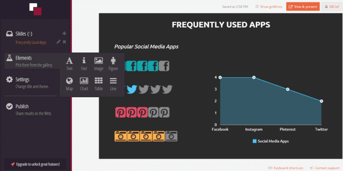 Простий трикроковий сервіс: оберіть шаблон, графічно унаочніть дані та поділіться інфографікою з друзями чи знайомими. Infogr.am – це інструмент, який найбільше підходить для створення схем, графіків і карт. Великий плюс − можливість завантажити фото й відео, аби зробити свою інфографіку інтерактивною. Дані готової роботи вносяться в таблицю, в якій будь-коли можна проводити редагування. Вбудований генератор автоматично оновить інфографіки.