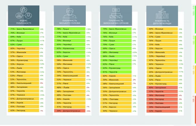 Показник публічності сформований на основі оцінки за трьома принципами: прозорість, відкритість та підзвітність різних суб’єктів місцевого самоврядування. Публічність Львівської міської ради в розрізі суб’єктів є такою: публічність міського голови – 48 %, виконавчих органів – 66 % та депутатів – 45 %. Пропри запровадження у Львові нових сервісів, таких як особистий кабінет мешканця, новий сайт депутатів, візуалізація бюджетних надходжень та видатків, досі не вирішеними залишаються питання звітності органів та посадових осіб місцевого самоврядування, депутатів перед територіальною громадою Львова, питання актуального і дієвого Статуту територіальної громади.