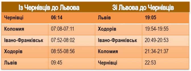 Зі Львова потяг відправлятиметься о 19:05 год. та прибуватиме до Чернівців о 22:35 год. На суміжних станціях прибуття «Регіонального експресу» планується на такий час: 19:54-19:55 – Ходорів, 20:49-20:53 – Івано-Франківськ, 21:34-21:37 – Коломия.