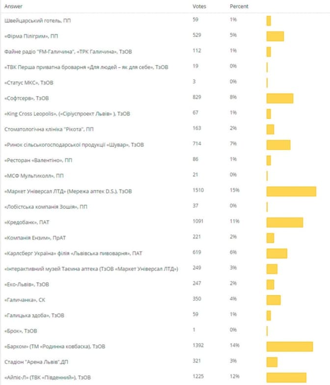 Лідером голосування стала компанія «Маркет Універсал ЛТД» (Мережа аптек D.S.), ТзОВ, яка отримала 1510 голосів.