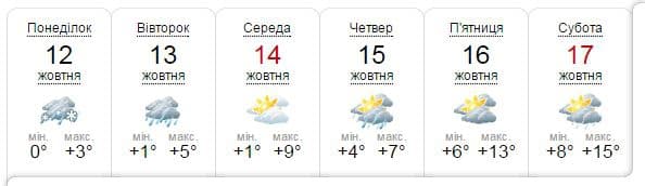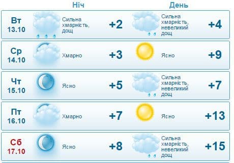 13 жовтня: хмарна погода з проясненнями. Вночі часом дощ, подекуди з мокрим снігом. Вдень місцями невеликий дощ. Вночі на окремих ділянках доріг ожеледиця. Вітер південно-східний 9-14 м/с. Температура повітря вночі – від 1° морозу до 4° тепла, вдень 3-8° тепла.
