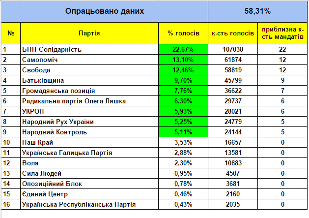 За попередніми даними, до Львівської обласної ради проходять дев’ять політичних партій.