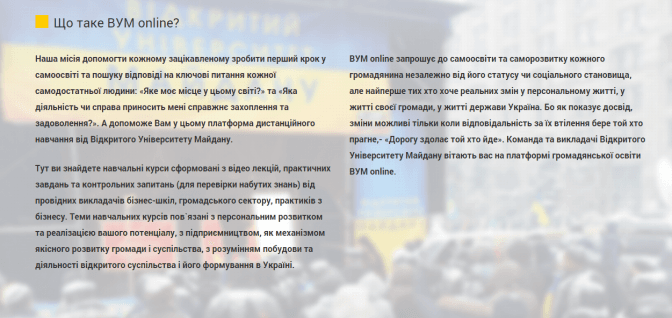 ВУМ-online — це дистанційна платформа громадянської освіти з рівним доступом до знань для кожного громадянина України. Ця освітня ініціатива громадських активістів, викладачів і випускників українських бізнес-шкіл виникла у грудні 2013 року, під час революційних подій на Майдані Незалежності. Проект дозволяє навчатися без прив`язки до комп`ютера. Проект у першу чергу зацікавить тих, хто хоче реальних змін як у своєму житті, так і в державі», – зазначають організатори.