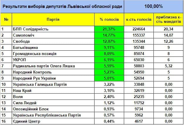За офіційними даними, до Львівської обласної ради проходять дев'ять політичних партій.