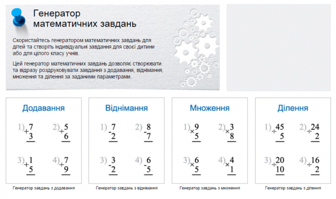 Виконання математичних завдань на додавання, віднімання, множення та ділення, складених «Генератором», дозволить дітям поступово, не форсуючи та не відчуваючи академічного тиску, вдосконалити свою арифметичну майстерність. А батькам – більше не турбуватись про пошук математичних вправ для своєї дитини, – зазначають творці онлайн-сервісу.