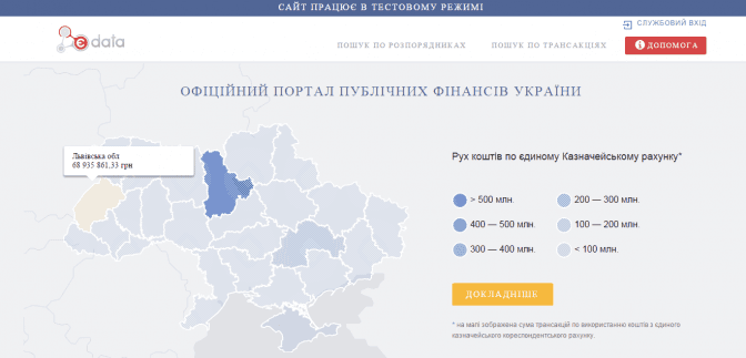 Дані про використання публічних коштів у кожному регіоні України оприлюднюватимуть на єдиному веб-порталі – www.e-data.gov.ua. Зокрема, на цьому інтернет-ресурсі розпорядники державних та місцевих бюджетів, Пенсійний фонд, а також фонди загальнообов’язкового державного соціального страхування публікують інформацію про заплановане і фактичне використання публічних коштів, обсяги бюджетних призначень та наданих кредитів, кладені договори та стан їх виконання, а також службові відрядження та витрати на них. Зараз сайт працює в тестовому режимі.