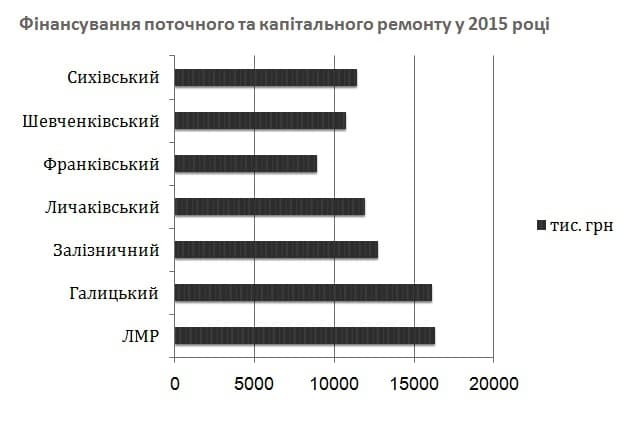 Найбільше коштів на ремонт отримає Галицька районна адміністрація – 16,1 млн грн. На другому місці Залізнична РА – 12,7 млн грн, на третьому – Личаківська РА, 11,9 млн грн. Майже стільки ж, як Личаківська РА, отримає Сихівська РА – 11,4 млн грн. На Шевченківський район витратять 10,7 млн грн. Найменше коштів отримає Франківська РА – 8,9 млн грн.