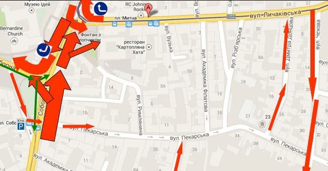 Із Личаківської буде дозволено лише правий поворот на вул. В. Винниченка. Водіям, які бажають проїхати на просп. Свободи, слід буде об'їхати наступним чином: вул. В. Винниченка – М. Кривоноса – І. Гонти – Торгова.