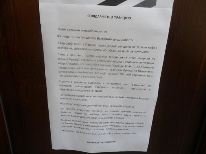 Консульство вивісило на своїх дверях лист, у якому висловлює солідарність із французьким народом.