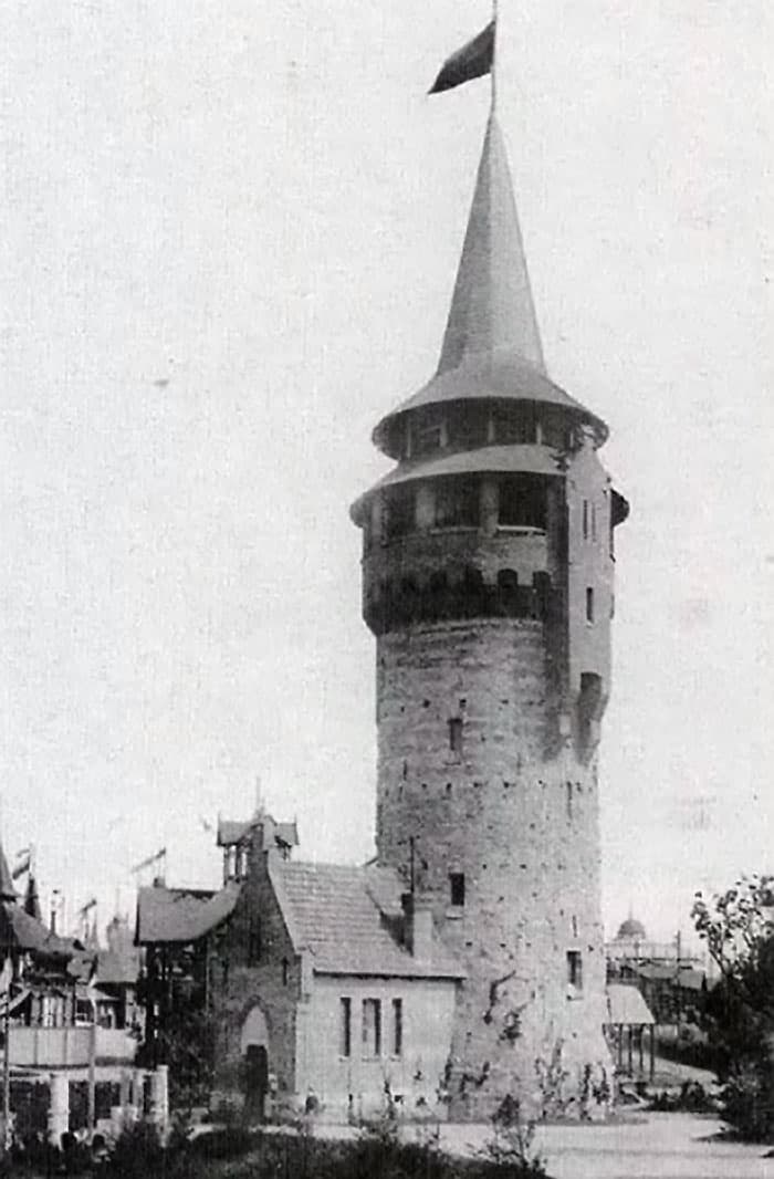 Вежа була споруджена у вигляді середньовічної башти і яскраво вписувалась в експозицію виставки. Ескіз будівлі зробив професор Юліан Захаревич. А ще маловідомий Міхал Лужецький перетворив цей ескіз в проект. Реалізували цей проект будівничі Юзеф Балабан та Влодзімєж Подгорецький. Основними будівничими матеріалами стали камінь та цегла. Проте, є легенда, що для будівництва також було використано кілька останніх пам’ятників давнього Стрийського кладовища, яке розміщувалось на території теперішнього парку ім. Б.Хмельницького. Загальна площа споруди становила 99.58 метрів квадратних. Окрім того, на 18-метровій вежі був встановлений водозбірник об’ємом 60 000 л., виконаний краківською фабрикою машин Леона Зеленевського.