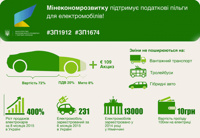 Водночас, ВР відмовилася підтримувати законопроект №1912, який передбачає тимчасове, до 1 січня 2020 року, звільнення від оподаткування ПДВ електромобілів, які ввозяться.
