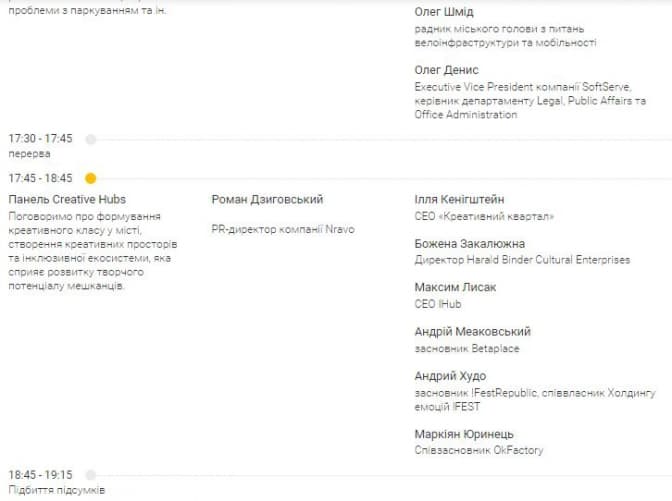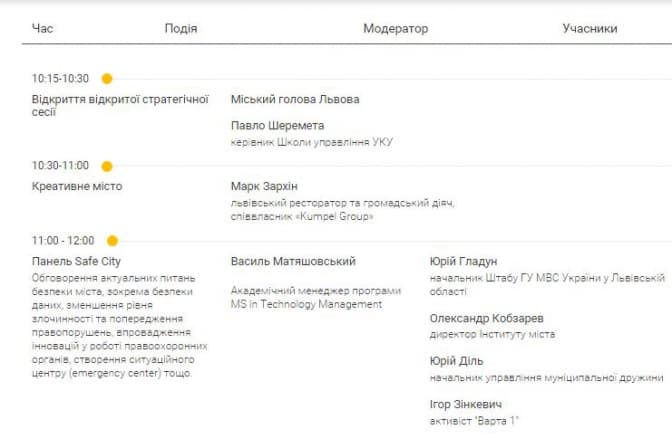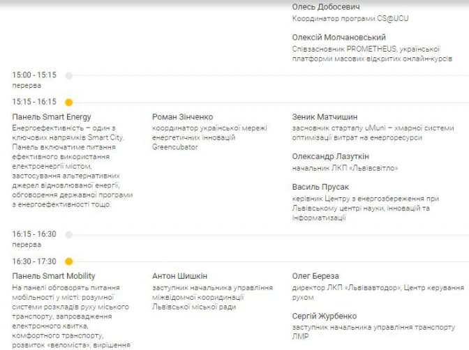 Серед доповідачів Lviv Smart City Day: Марк Зархін, співвласник «Kumpel Group», Роман Зінченко, координатор Greencubator, Володимир Зуб, начальник управління охорони здоров'я ЛМР, Павло Шеремета, керівник Школи управління УКУ, Олег Береза, директор ЛКП «Львівавтодор», Юрій Гладун, начальник штабу ГУ МВС України у Львівській області, Олег Денис, Executive Vice President компанії SoftServe, Юрій Діль, співкоординатор Центру безпеки міста,Божена Закалюжна, директор Harald Binder Cultural Enterprises, Маркіян Юринець, співзасновник OkFactory, Олександр Кобзарев, директор Інституту міста, Зеновій Матчишин, засновник стартапу uMuni – хмарної системи витрат енергоресурсів, Андрій Худо, засновник !FestRepublic, Ярослав Притула, керівник Програми комп’ютерних наук УКУ та інші.