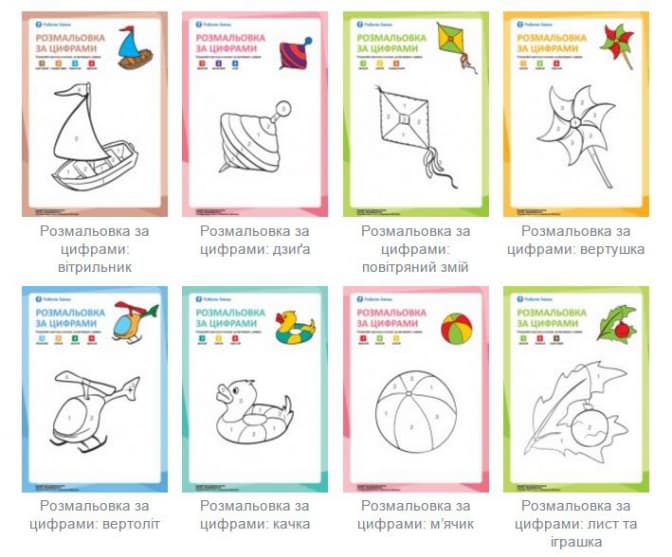 У кожному завданні комплекту дитині пропонують розмалювати різноманітні зображення у кольори, що відповідають цифрам від одного до п’яти. Під час роботи над завданням дитина вчиться впізнавати цифри від одного до п’яти та знатиме їх написання, що стане добрим підґрунтям для подальшого навчання рахунку.