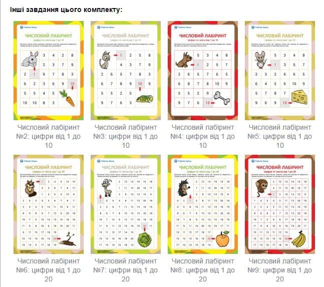 Комплект містить п’ять завдань з простим лабіринтом (цифри від одного до десяти) та п’ять завдань більшої складності (цифри та числа від одного до двадцяти). Завдання стане добрим підґрунтям для кращого вивчення цифр і чисел та подальшого навчання рахунку.