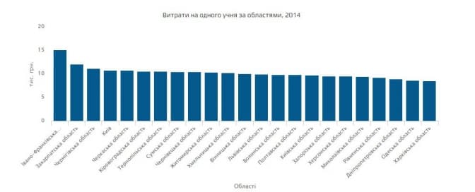 Також можна переглянути скільки витрачають тисяч гривень на одного учня. Так, по Львівській області на одного учня доводиться 9,9 тис. гривень.