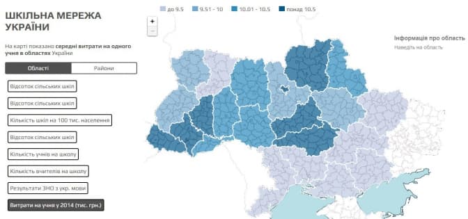 Зокрема, обравши вкладку «Кількість шкіл на 100 тис. населення» можна дізнатися про кількість навчальних закладів по областях і районах. Для цього достатньо відфільтрувати «по районах» та «по областях». Так, на Львівську область приходиться 54,89 шкіл на 100 тисяч населення.