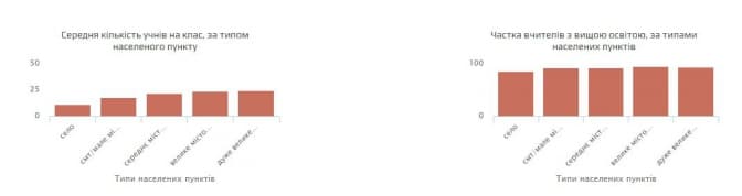 За фільтром «Кількість учнів на школу» можна побачити, в якій області чи районі найбліше/найменше дітей припадає на одну школу.