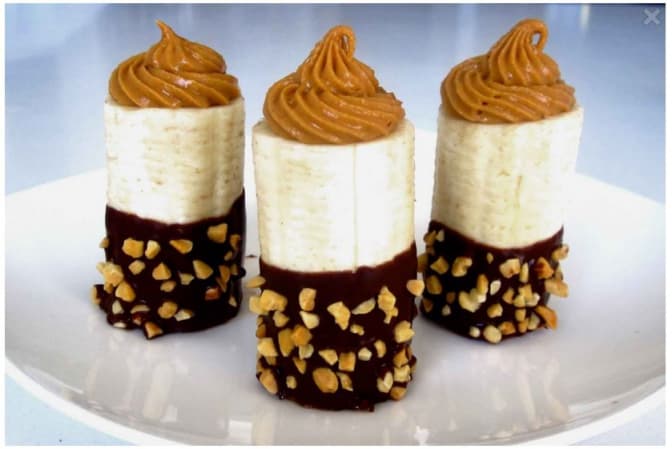 Банани почистити та розрізати на три шматки. З кожного шматочка за допомогою десертної ложки вибрати серединку. Цю м’якоть змішати з вареним згущеним молоком. Горіхи подрібнити. Шоколад розтопити на водяній бані або в мікрохвильовій печі. Кожен шматок банану обмакнути в шоколад до половини та присипати горіхами. Дати шоколаду застигнути. Перекласти згущене молоко у кулінарний мішечок та видавити у серединки бананів.