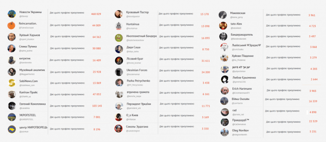 Користувач твіттера під ніком Львівський батяр проаналізував популярні акаунти, які було заблоковано в останні тижні і звів їх у спільну таблицю (але кількість заблокованих користувачів давно вже перевищила кілька сотень)