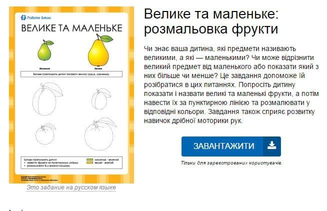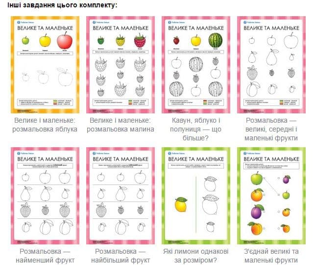У завданнях дитині необхідно знаходити фрукти різного розміру, визначати які є більшими, а які меншими, порівнювати різні фрукти за розміром, визначати найбільші та найменші фрукти, вчитися писати слова «великий», «маленький» і «середній», розфарбовувати фрукти в різні кольори.