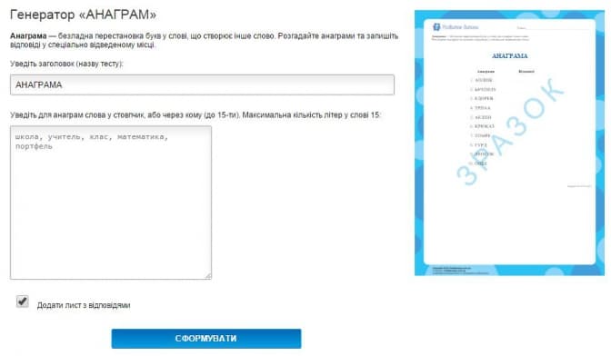 За допомогою генератора створюються завдання-анаграми з будь-яких слів на ваш вибір. У завданнях застосовується комплексний підхід, адже окрім безпосереднього розгадування, дитина повинна написати розшифроване слово у відведеному місці, що покращуватиме її навички письма та правопису», – пише портал Osvita.ua.