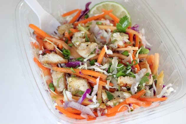 Ріжете курячу грудку кубиками, соліть, перчите, обтираєте подрібненим часником і залишаєте трохи постояти при кімнатній температурі. Розігріваєте сковороду, додаєте туди оливкову олію і смажите курку до золотистої скоринки. Якщо вас не влаштовує смажена грудка, можете її відварити. Готову грудку змочіть соком лайма і залишаєте остигати. Змішуєте нарізану капусту, цибулю, дайкон, морква і кинзу у великій мисці. Потім змішуєте всі інгредієнти для салатної заправки і збиваєте блендером до однорідності. Додаєте до салату смажену курячу грудку і заправку, добре все перемішуєте та подаєте на стіл.