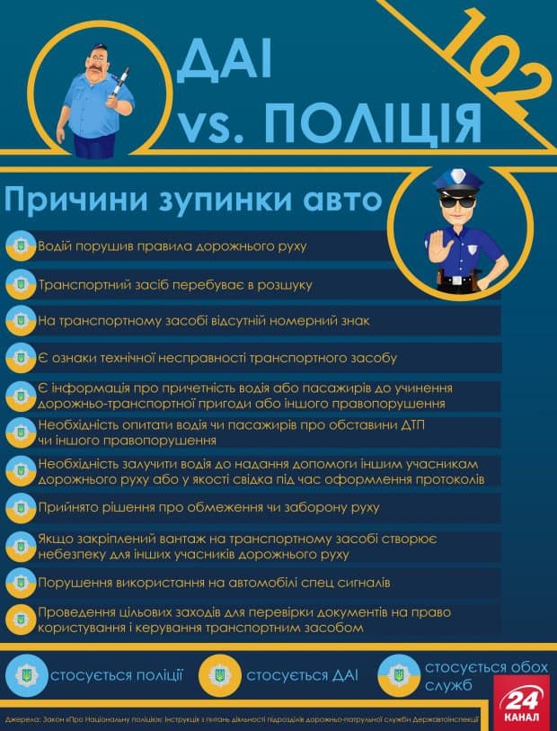 У пропонваній інфографіці зібрали і порівняли причини, які дозволяють працівникам ДАІ та нової патрульної поліції зупинити ваш автомобіль. Правила зупинки автомобіля прописані в статті 35 закону Про національну поліцію. Перше, що ви повинні знати — поліцейський зобов'язаний назвати причину, по якій він зупинив ваш автомобіль, – повідомляє сайт «24 каналу».