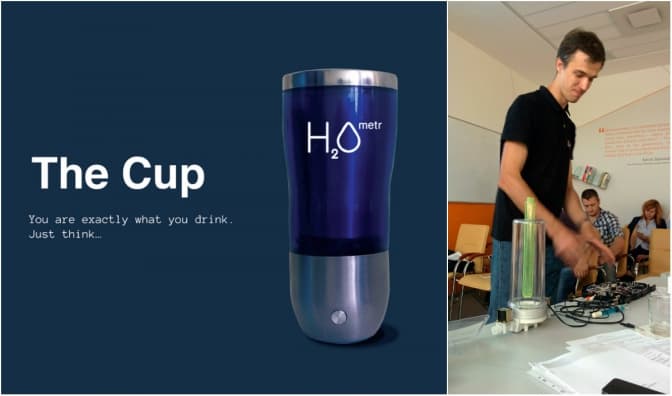 РС: За основу ми взяли звичайне термогорнятко. Нижню частину горнятка зробили з кришки звичайного термосу, у яку вмонтували спеціальну мікросхему. Додали туди багато датчиків, які розробив Слава: самотужки їх виготовити в рази дешевше і простіше, ніж купити готові. Саме вони і аналізують воду з допомогою дуже слабенького струму. Таким струмом неможливо скалічити себе, його потужність навіть слабша, аніж статичний струм від «електризованого» одягу. Але його цілком достатньо для аналізу води. Хоча, в ідеалі, це буде спектральний аналіз води. Додали і «fancy stuff» – безпровідну зарядку для цього горнятка та підсвітку. І усвідомили, що з таким продуктом можна уже виходити на ринок. Єдине, що стає на заваді презентації проекту на широкий загал – це те, що прорахувати собівартість існуючого прототипу зараз практично нереально, бо всі елементи горнятка зроблені вручну.