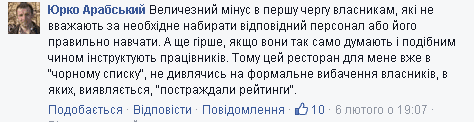 Сам ж Роман Кисляк написав, що після вибачень керівництва ресторану конфлікт вичерпано.