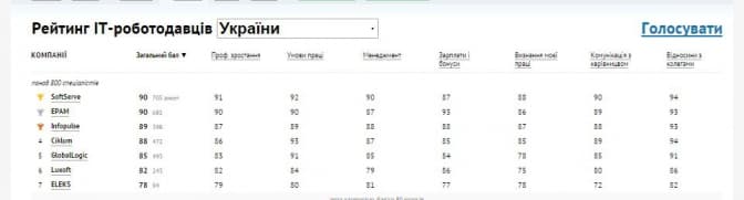 Таким чином, компанія SoftServe стала кращим роботодавцем категорії «від 800 співробітників» у 2015-му. Також ця львівська компанія стала переможцем за такими шкалами оцінювання великих компаній: професійний ріст, менеджмент, визнання роботи кожного працівника та відносити з колегами.