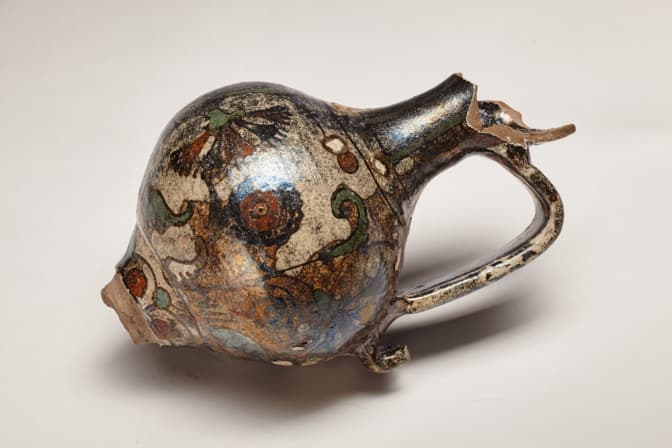 5. Ще однією цікавою знахідкою минулого року є фрагменти глечика XV-XVI ст. з території синагоги «Золота Роза». Він розписаний у східному стилі і, очевидно, був завезений сюди зі сходу чи півдня. Збережена висота глечика усього 20 см і, ймовірно, що його могли використовувати для вина.
