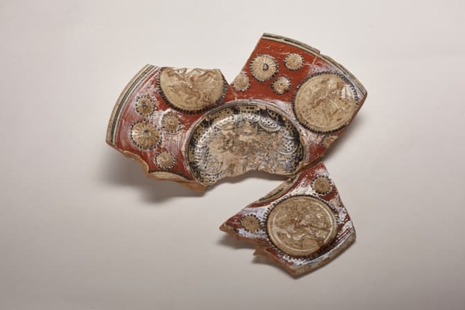 6. У XVIII ст. дуже популярними серед заможних людей були декоративні полив'яні миски, оскільки технологія їхнього виготовлення сягнула високого рівня. Одну з таких мисок було виявлено на під час досліджень на розі вул. Краківська – Вірменська. Вона має круглу форму, а на її поверхні зображено чотири медальйони з вершниками.