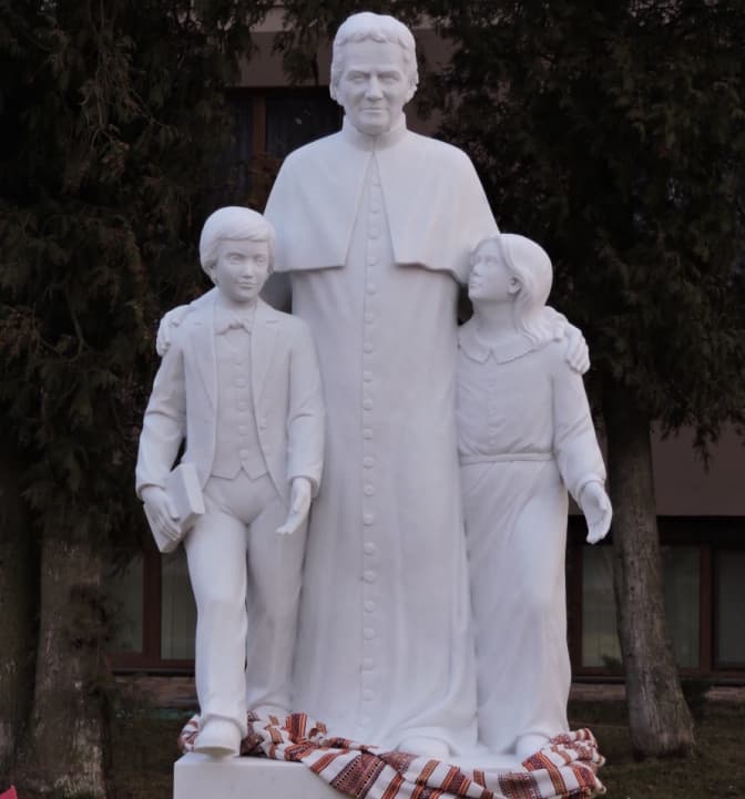 Скульптуру подарував Салезіянам УГКЦ отець Бернард Скуза з міста Каррари. Постамент виготовлений з білого каррарського мармуру і зображає отця Боско та його вихованців: святого Домініка Савіо і блаженну Лауру Вікуню, які стали святими завдяки своєму наставнику, – інформують у спільноті салезіян.
