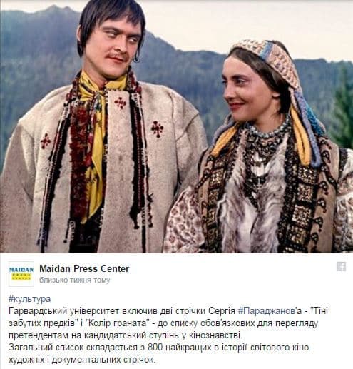 «Гарвардський університет включив дві стрічки Сергія Параджанова – «Тіні забутих предків» і «Колір граната» до списку обов’язкових для перегляду претендентам на кандидатський ступінь у кінознавстві», – йдеться у повідомленні Maidan Press Center.