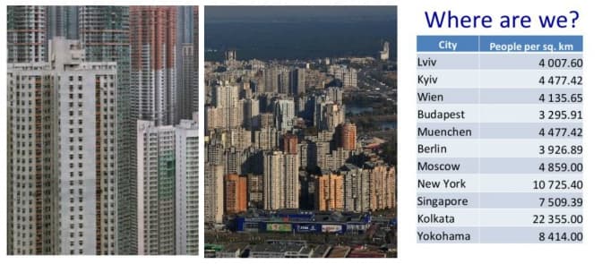 Щільність (або густота населення) – одна з найважливіших характеристик міста. На зображенні нижче – Гонконг та Київ. Зараз міста у всьому світі ростуть вгору. Це глобальна тенденція. Це триватиме і в майбутньому. Ми не зможемо на це впливати, але мусимо контролювати цей процес.