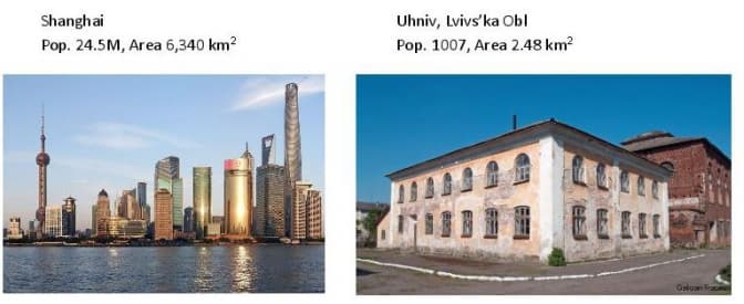 Міста можуть бути різними за кількістю населення. Візьмемо, наприклад, Шанхай, де живуть понад 24 мільйони. І візьмемо місто Угнів у Львівській області, населення якого становить 1007 людей.