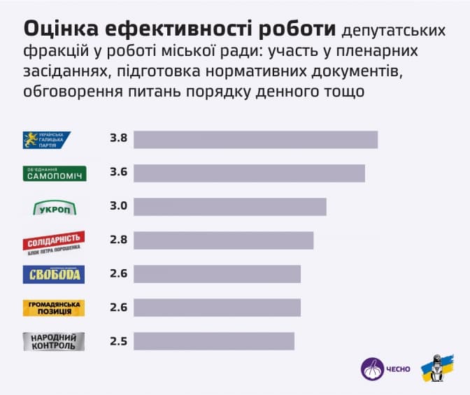 Фракціям виставляли оцінки за виконання обіцянок, публічність, комунікацію з виборцями та послідовність дій. Найвищі оцінки за більшістю показників отримала Українська Галицька Партія.