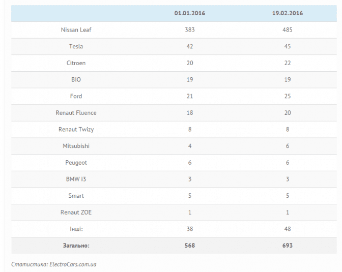 Приріст електричних авто склав 125 одиниць. Про це повідомляє інтернет-портал ElectroCars. Станом на 1 січня 2016 року офіційно в Україні було зафіксовано 568 електромобілів. До середини лютого українці вже користувалися 693 електрокарами. Прогнозують, що за півроку їх кількість може подвоїтися.