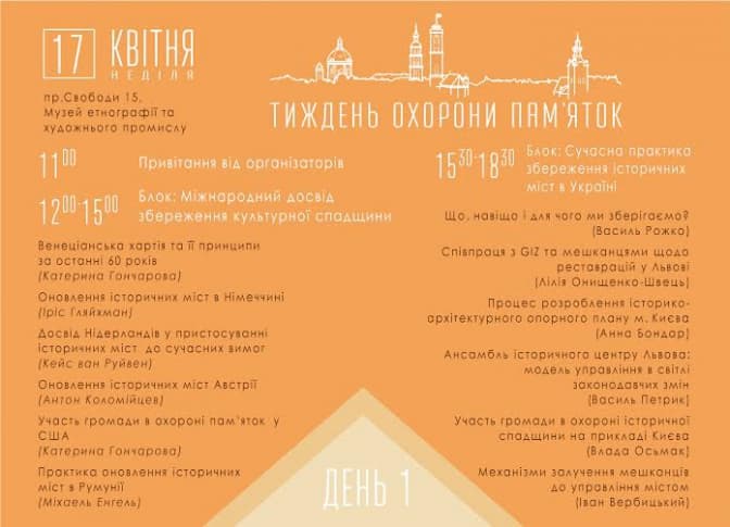 17 квітня – відкрита конференція «Збереження спадщини та оновлення міста» (пр. Свободи 15, Музей етнографії та художнього промислу). Вхід вільний.