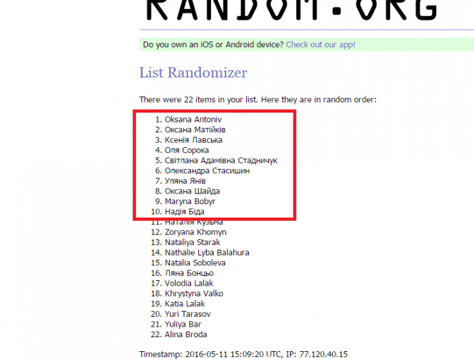 За результатами random.org переможцями стали: