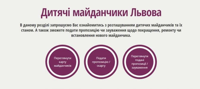 «Карта дитячих майданчиків» — це проект, який придумала та розробила ГО «Батьки в дії» спільно з управлінням сім’ї, молоді та спорту ЛМР. Ідея виникла у кількох львівських мам, які щодня гуляючи на дитячих майданчиках, зрозуміли, що догляд за майданчиками відбувається незадовільно, а куди надсилати скаргу батьки не знають, і на звернення тих, хто пробував скаржитись, часто ніхто не реагував. Ця карта повинна стати сучасним рішенням для батьків, які хочуть ознайомитися зі станом певних дитячих майданчиків, повідомити про поломки на території майданчику, а також знайти місце, де можна погуляти із дитиною», – розповідає голова ГО «Батьки в дії» Юля Гвоздович, депутат Львівської міської ради.