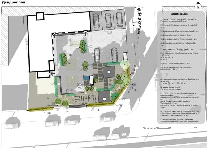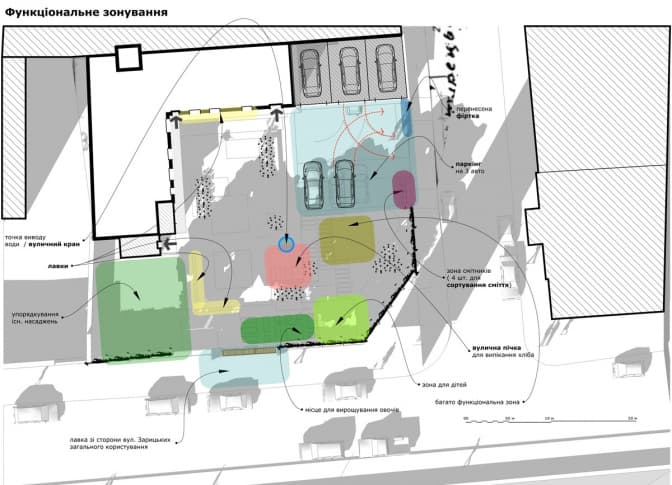 Більшість території двору вкрита старим асфальтом та використовується для паркування кількох машин. Головна ідея запропонованого зонування полягає в тому, щоби винести паркування ближче до воріт і там облаштувати місце для сміттєвих контейнерів, якими користувалися би лише мешканці двору, а решту території облаштувати для дозвілля та відпочинку.